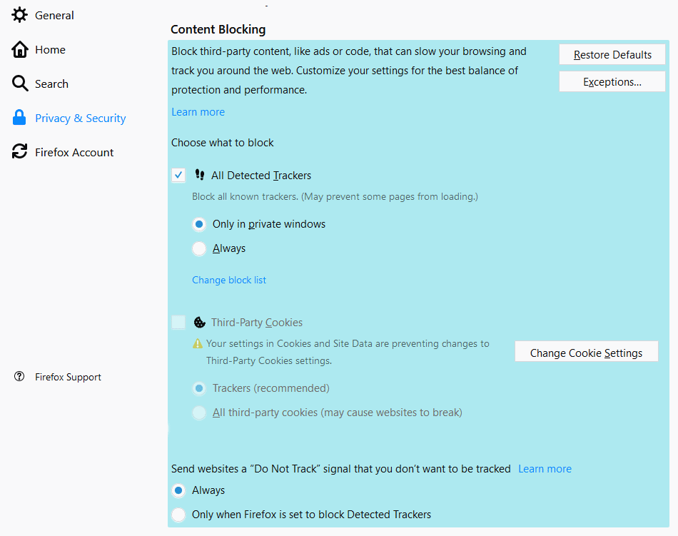Rebranded as Enhanced Tracking Protection or Content Blocking, this feature works by blocking all "trackers," as defined by the Disconnect.me blocklist, which Mozilla has been using since the feature's earliest days.