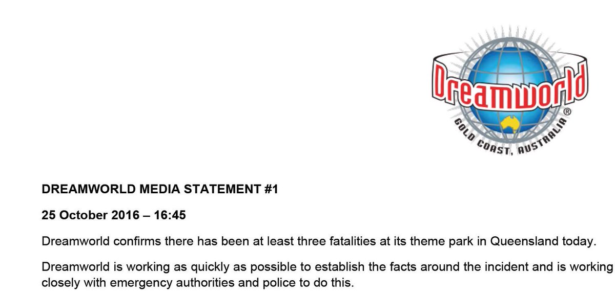 Police confirm four people were killed in an accident on one of the park’s rides after being ‘injured by a conveyor belt’ Guardian UK, 25 October 2016 Four people have died in an accident at Dreamworld theme park on the Gold Coast. The park initially confirmed three deaths in a statement on Tuesday afternoon. Police subsequently raised the death toll to four. In a statement they said police were called to the site about 2.20pm following “reports that a number of people had been injured by a conveyor belt”. It is believed the accident happened on the Thunder River Rapids ride. Associated Press reported the people killed were two men and two women. Quote: