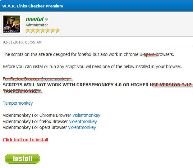 https://www.tampermonkey.net/ ![]() When you enter the site, the browser you are using should be shown chosen automatically. Click the "Download" button (green arrow) and you will be forwarded to the add-on web site where you can download and install the extension. If you have any problems downloading & installing, watch the video on the Tampermonkey webpage ++++++++++++++++++++++++++++++++++++++++++++++++++ ++++++++++ And for Opera users, the Extension is "Violent Monkey" UPDATE: It seems that Violent Monkey is no longer supported by Opera Browser. We suggest that you use either Firefox or Chrome with Tampermonkey for this purpose. We apologize for any inconvenience. ================================================== ========== Unfortunately, IE users can not use these extensions. I recommend using Firefox to be able to check links in this manner. UPDATE: Tampermonkey / WAR may work with Microsoft Edge. If anyone can confirm this, please post a reply below ================================================== ========== Now the first part is done ... The next part is just as easy Now you need to install a small user script called: W.A.R. Links Checker Customized - Premium Link Version I have chosen the Premium Link Version because, not only will it show you if the links are working, but it will also show if it is a Premium link. A Premium link can only be downloaded by a user who has a Premium account with that filehost. Installing the W.A.R. User Script Open this webpage with the browser you have Greasemonkey installed to: Code: [Check Download Links]