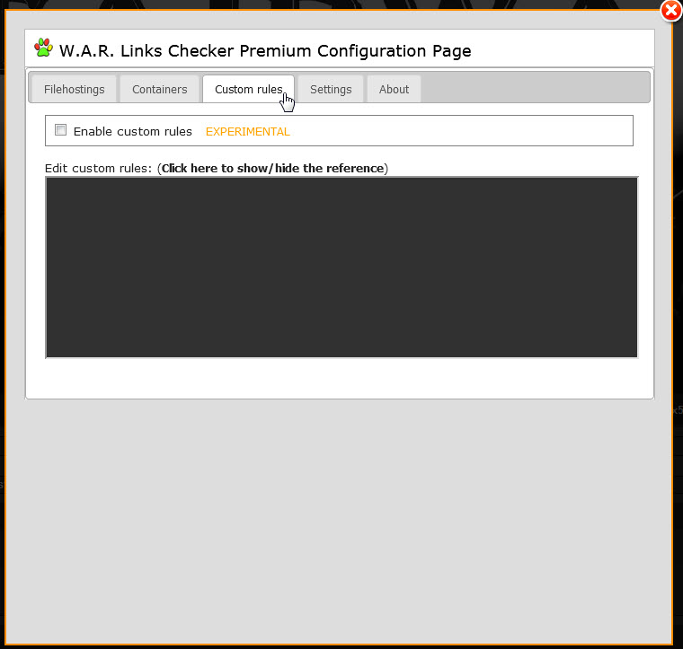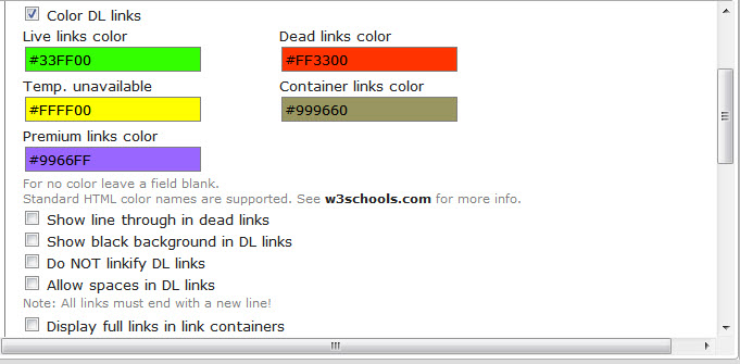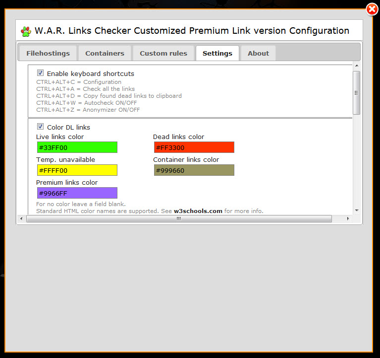 http://usa.x10host.com/mybb/showthread.php?tid=23 ![]() On the left, you will see a green "Install" button Simply click the button and the W.A.R. User Script will install itself automatically You may read the Summary below the Install button, but a more detailed description has been posted below. Now on to the Configuration !!! Now that you have both Tampermonkey installed, you should check that it is set to update automatically. To do this, click the "Tools" button in your browsers Menu Bar and select "Add-ons" ![]() Find the Extension "Tampermonkey" and click it ![]() In the window that appears, make sure that the radio button in the "Allow automatic updates" is set to "On" ![]() This will allow Tampermonkey to automatically update. Now on to the W.A.R. Link Checker Configuration Manager: NOTE: Due to coding conflicts, the W.A.R. Configuration Manager will not display correctly on some sites I suggest opening a new tab and going to another website (yahoo works OK). You can switch between tabs to continue reading this & editing W.A.R. on the other tab. The Manager window will not close until you click the "X" or close the tab. Click the Tampermonkey icon and select "[W.A.R. Links Checker] Configuration ![]() (Note: If you do not see the Configuration selection, make sure the ON/OFF button to the left of "W.A.R. links Checker Premium" is on. The switch should be green.) When clicked, the W.A.R. Configuration Manager will appear. The first thing you should do is to click the "Select All" button. This will ensure all of the file-hosts are selected. ![]() Next, scroll down and un-tick the "Obsolete file hosts" button ![]() This will prevent W.A.R. from checking older, unused file hosts & allow it to run faster. The next tab configures web "Containers" ![]() The "Select None" button should be used as container links are not allowed at some sites ++++++++++++++++++++++++++++++++++++++++++++++++++ ++++++ The next tab is "Custom rules" ![]() This section should be left to advanced users. If you are comfortable editing Custom Rules, this is the section to do so. The next tab is the "Settings" tab This is where you configure how W.A.R. looks & performs ![]() ++++++++++++++++++++++++++++++++++++++++++++++++++ ++++++ The top section allows you to chose if you want to use the built in keyboard shortcuts. ![]() If you already have these shortcuts enabled with other resources, make sure you un-tick this box. ++++++++++++++++++++++++++++++++++++++++++++++++++ ++++++ The next section allows you to colorize the links you are checking I highly suggest leaving this enabled, as this is how you will see if your links are good or not. ![]() Note that the colors used here are not the default colors that come with W.A.R. You may pick the colors you want by right-clicking the w3schools.com link & opening in a new window. You can change the color by editing the hex code in each color box. I suggest copying each hex code before you change it, so you can change it back if needed. ++++++++++++++++++++++++++++++++++++++++++++++++++ ++++++ Below the colors, there are a few options on how you would like W.A.R. to configure the links If you need help with these, please feel free to ask. ++++++++++++++++++++++++++++++++++++++++++++++++++ ++++++ Right below that, you can chose which icon to use ![]() This is not mandatory ... it just adds another visualization to your links. ++++++++++++++++++++++++++++++++++++++++++++++++++ ++++++ The last part of this tab has a few more settings: ![]() * Autocheck W.A.R. starts checking links automatically * Show progress stats this shows a very small progress bar at the bottom right corner of your browser * Display tooltip info This shows a popup with the file name, file size ... etc. Nice option, but slows W.A.R down considerably * Enable Anonymizer This will prevent links from becoming "live" by removing any referrals The last tab is the "About" tab ![]() This just shows current information about the W.A.R. Link Checker. There is nothing to change or set here If you have followed this tutorial & set the options as I have shown, you can easily check the download links posted. This is how a page with multiple links will look: ![]() SEE ??? I TOLD YOU IT WAS EASY !!!! Now that you can easily check links |