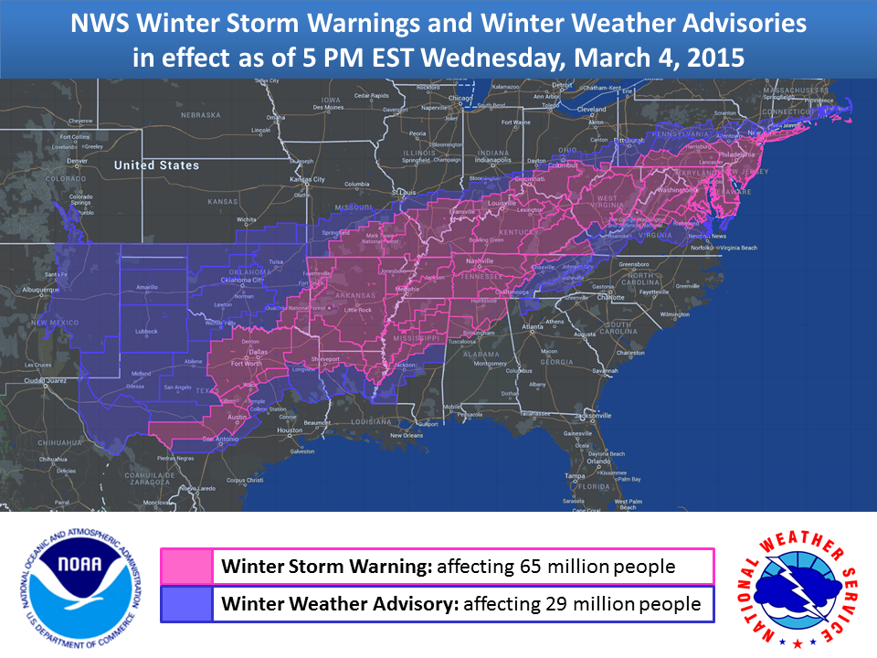 For its sheer size, this one is a monster, stretching from New Mexico to southern New England. If you're keeping track on your maps at home, that's 2,000 miles of snowy misery and 94 million people under some sort of winter weather warning, watch or advisory. Some Tweets From Different states: Texas Enough of the sleet and ice in the Dallas area. More than 640 arrivals and departures were canceled at Dallas/Fort Worth International Airport on Wednesday. Another 540 have been scrubbed for Thursday. Oklahoma Enough snow to hide your energy drink. Kentucky Enough snow to cover the yard and street. Some areas will get 6 to 10 inches. People in Kentucky will have plenty of snowman-building material. Washington D.C. Enough snow for a snow emergency. The federal government is closed on Thursday. Tennessee Enough snow to eat ice cream. New Mexico Enough snow to ... Actually, New Mexico is weird. New Jersey Enough snow for a snow day. West Virginia and Pennsylvania Enough snow and rain to cause problems. The area will get up to 4 inches of rain before it turns to snow. The National Weather Service warned that flooding could be an issue, especially across the lower Ohio Valley and western Mid-Atlantic regions. CNN affiliate WCHS reports a mudslide in Mingo County, West Virginia, sent one woman to the hospital. Massachusetts Enough snow to go totally nuts. So far this season Boston has seen 105.7 inches -- almost 9 feet -- of snow. That's just 1.9 inches short of the record set nine years ago. More snow is expected from this system, but it's not likely to be enough to break the record as the forecast models indicate the majority of snow will stay south of the city. There is a slim chance of snow on Thursday, followed by days of sunshine and temperatures near 40 by Monday.