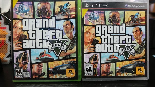 Copies of Grand Theft Auto V displayed at the 8 Bit & Up video game shop in Manhattan's East Village on September 18, 2013 in New York. Three British teenagers have been charged over the stabbing and robbery of a man who was walking home after buying the blockbuster videogame, police said on Saturday. (Getty Images/AFP/File)