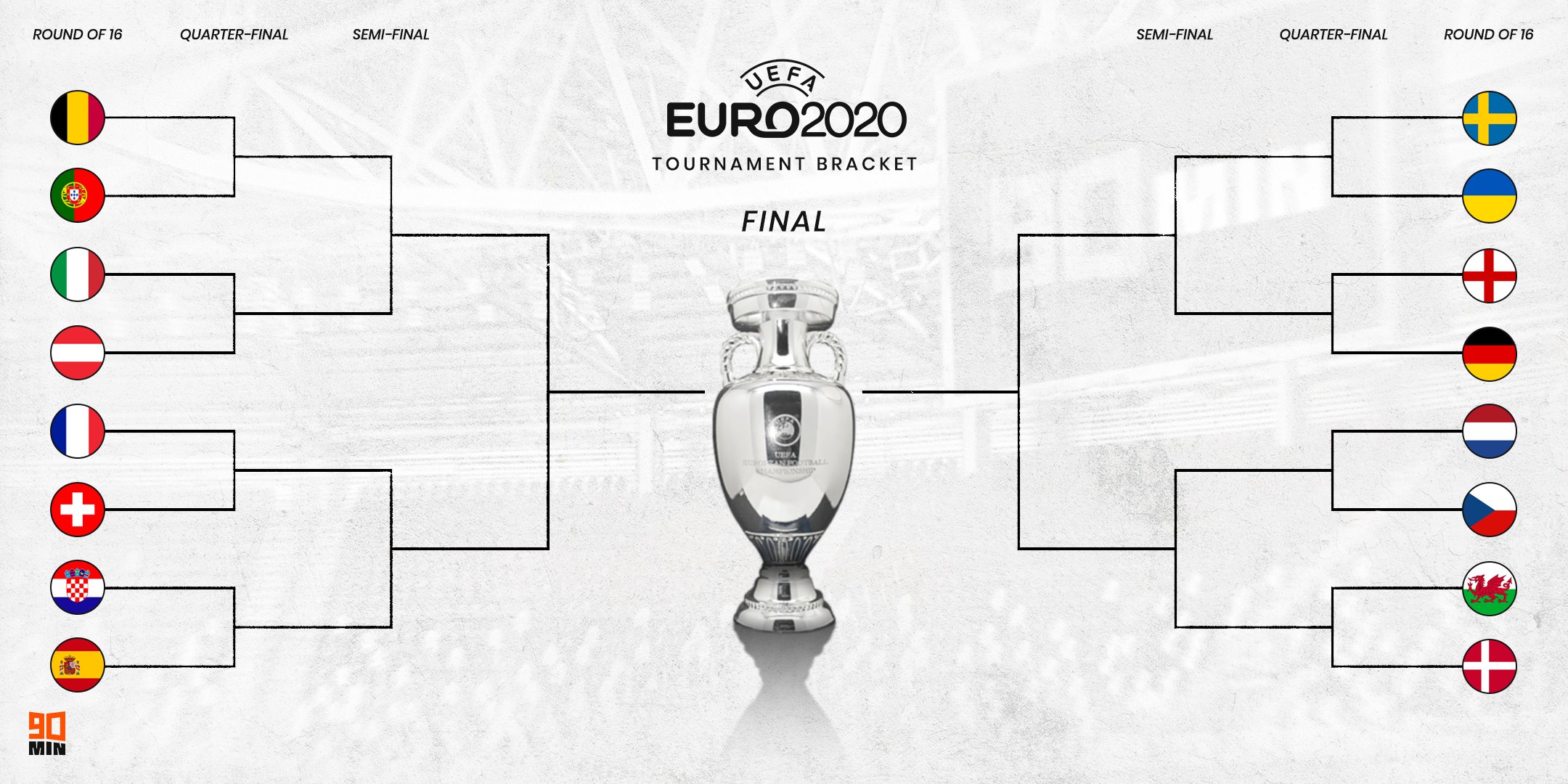 ![]() Began Friday, June 11, 2021 Ends Sunday, July 11, 2021 ![]() Last 16 in Full After Portugal and France Play Out Thrilling Draw The Euro 2020 group stages have concluded meaning the last 16 is now finalised with England squaring off against Germany at Wembley and Wales facing Denmark Daily Mirror UK, 24 JUN 2021 Euro 2020 last 16 draw Wales vs Denmark, June 26, Amsterdam Italy vs Austria, June 26, London Netherlands vs Czech Republic, June 27, Budapest Belgium vs Portugal, June 27, Seville Croatia vs Spain, June 28, Copenhagen France vs Switzerland, June 28, Bucharest England vs Germany, June 29, London Sweden vs Ukraine, June 29, Glasgow